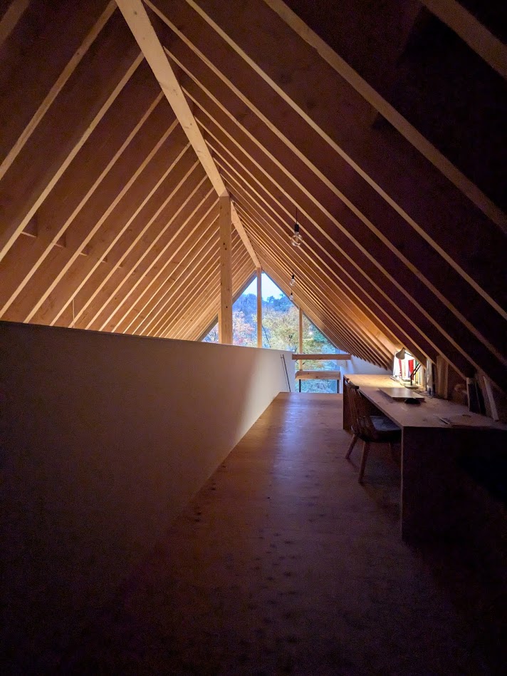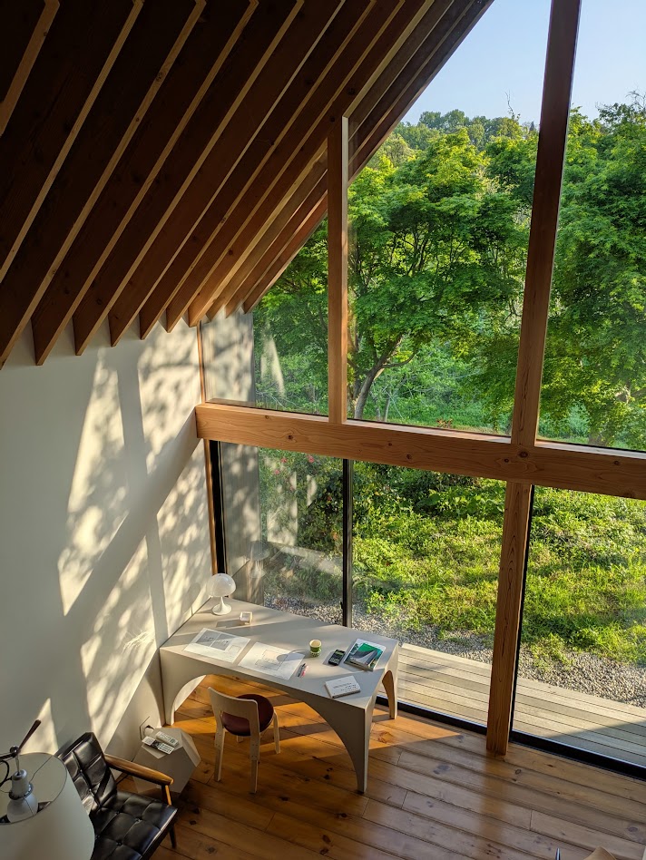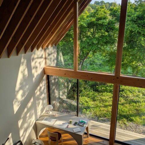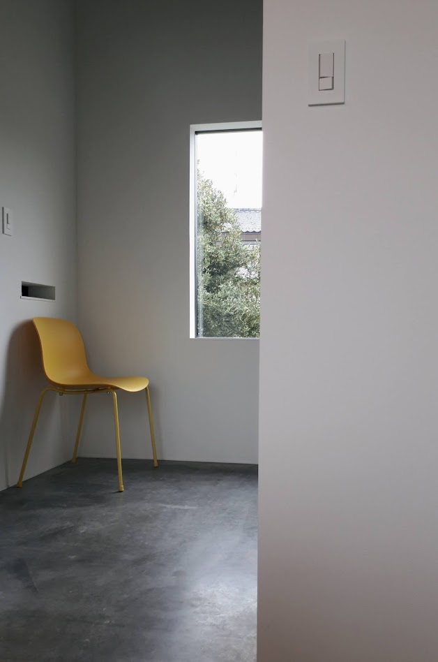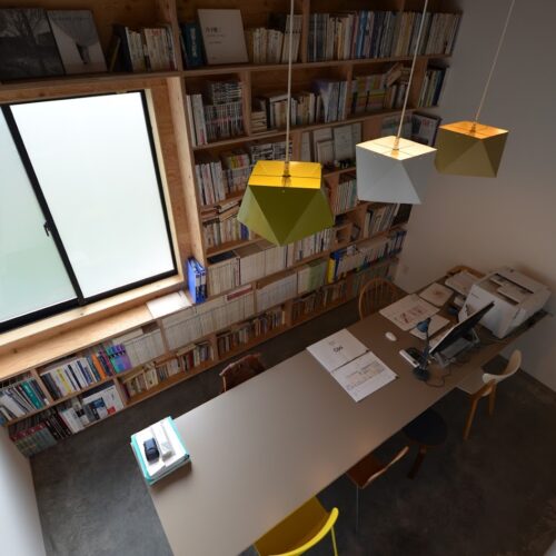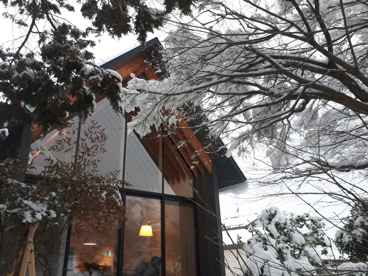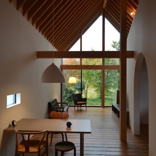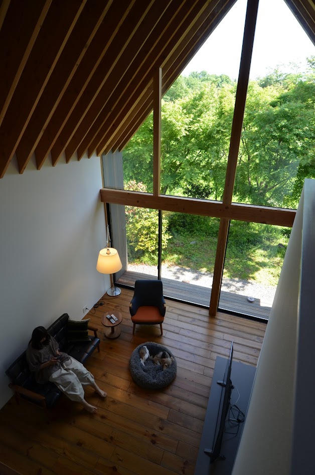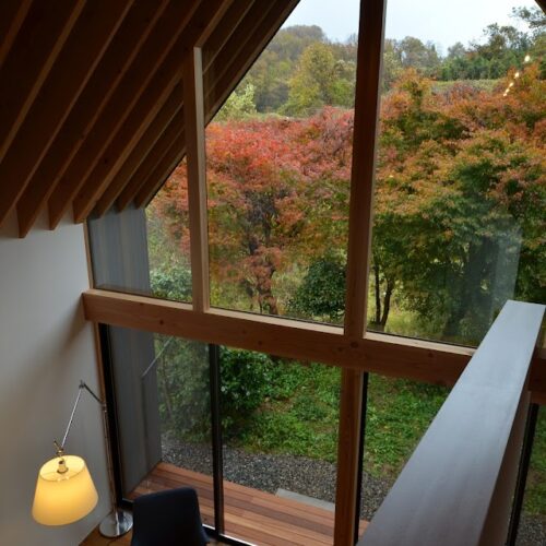 地盤に高低差があり、間口も細く、区画も曖昧な調整区域の土地が石川県金沢市の端に残っていた。万人受けしない、誰もやりたがらなさそうな土地がなんだかとてもステキに感じクライアントと前向きに考えることにした。「カーテンレスの大きな窓を設けたい」というリクエストにドンピシャの土地だったからである。計画地は金沢の景観条例地域であることから勾配屋根と板張りの外壁がすぐに頭に浮かんだ。風致地区ということもあり隣地との離隔距離も必要で建物の幅はさらに細くなっていった。プラン検討しながら頭の中にあるのは敷地の奥に見える景色と元々植えてあった木々のこと。四季を楽しめる美しい景色に向かうトンネル状の構造へとペンが誘導されていった。土地に出会って4~5日の出来事である。 それから土地購入へと動き出した。建物の形状はイエ型。建物中央に斜めの壁が入っているのは景色に向かって視界が広がっていくようにしたかったためである。間取りは道路側に玄関と書斎、奥へ進むにつれてプライベートな空間へと続く。二階のような屋根裏のような広いフリー空間が上に存在する。間取りはすべて景色のため。大きな窓があるだけ。それだけでよかった。この建築を語るうえで大事なのはやはり施工者の存在であろう。細かな施工者泣かせのディティールを「気合です!」の一言ですべて作り上げてくれたのは本当に頼もしかった。建築から迫力を感じていただけたのであればそれは繊細な現場監督と気合十分の棟梁のおかげである。