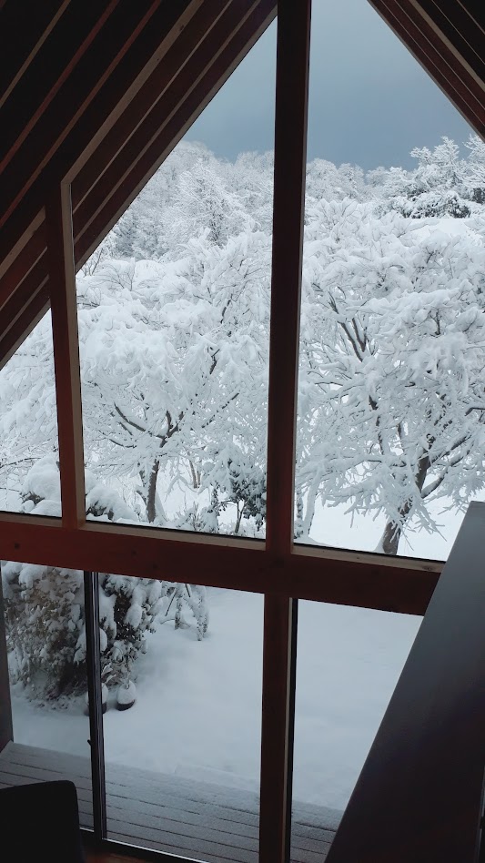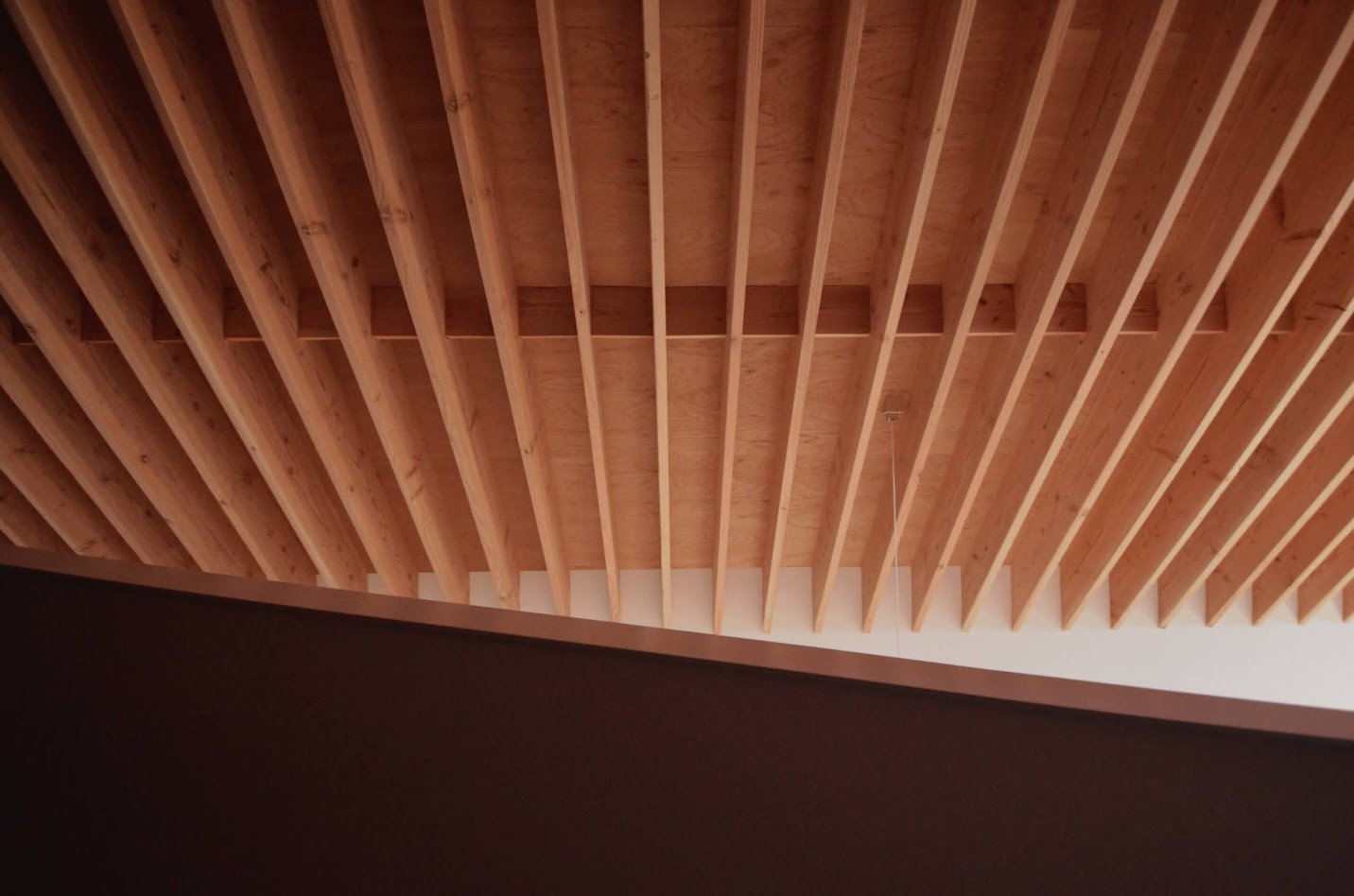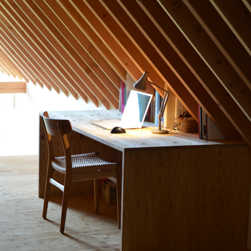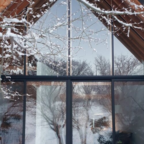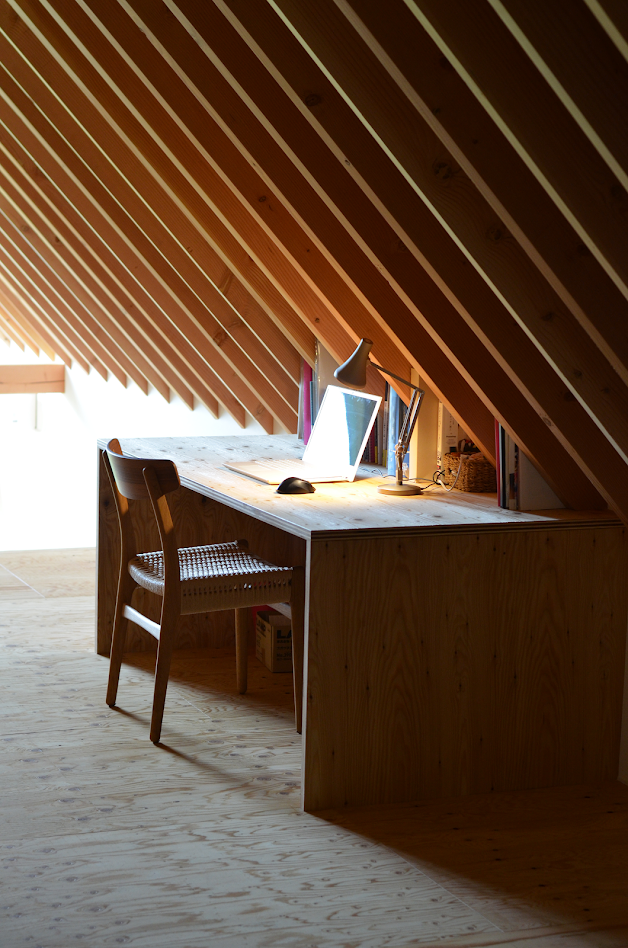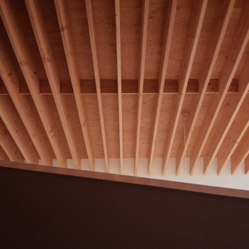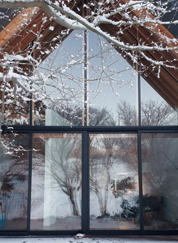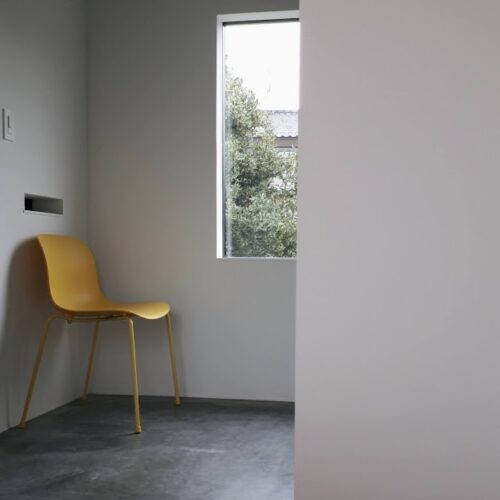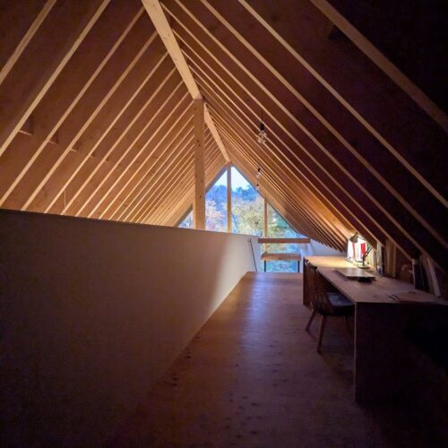 地盤に高低差があり、間口も細く、区画も曖昧な調整区域の土地が石川県金沢市の端に残っていた。万人受けしない、誰もやりたがらなさそうな土地がなんだかとてもステキに感じクライアントと前向きに考えることにした。「カーテンレスの大きな窓を設けたい」というリクエストにドンピシャの土地だったからである。計画地は金沢の景観条例地域であることから勾配屋根と板張りの外壁がすぐに頭に浮かんだ。風致地区ということもあり隣地との離隔距離も必要で建物の幅はさらに細くなっていった。プラン検討しながら頭の中にあるのは敷地の奥に見える景色と元々植えてあった木々のこと。四季を楽しめる美しい景色に向かうトンネル状の構造へとペンが誘導されていった。土地に出会って4~5日の出来事である。 それから土地購入へと動き出した。建物の形状はイエ型。建物中央に斜めの壁が入っているのは景色に向かって視界が広がっていくようにしたかったためである。間取りは道路側に玄関と書斎、奥へ進むにつれてプライベートな空間へと続く。二階のような屋根裏のような広いフリー空間が上に存在する。間取りはすべて景色のため。大きな窓があるだけ。それだけでよかった。この建築を語るうえで大事なのはやはり施工者の存在であろう。細かな施工者泣かせのディティールを「気合です!」の一言ですべて作り上げてくれたのは本当に頼もしかった。建築から迫力を感じていただけたのであればそれは繊細な現場監督と気合十分の棟梁のおかげである。